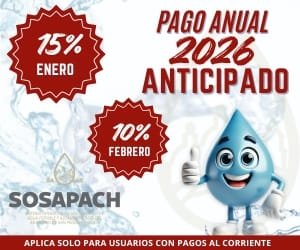 El Sistema Operador de los Servicios de Agua Potable y Alcantarillado del Municipio de San Pedro Cholula (SOSAPACH) informa a la ciudadanía que continúa vigente el programa de Pago Anual…