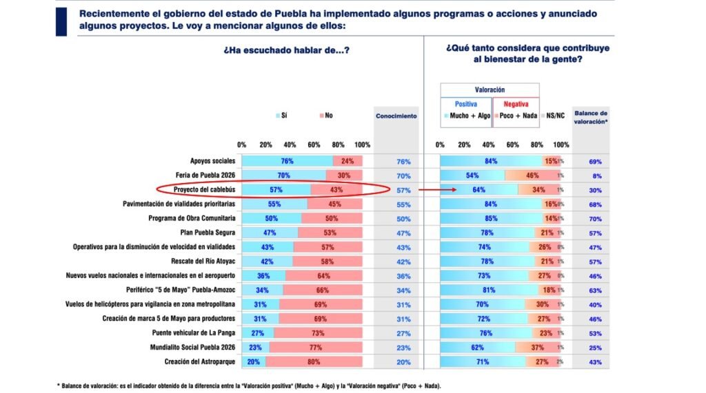 El Proyecto del Cablebús en Puebla destaca por su alto nivel de aceptación ciudadana, ya que el 64% de los poblanos considera que contribuirá positivamente al bienestar de la gente. Esta cifra lo posiciona como una de las iniciativas mejor valoradas entre las acciones recientes del gobierno estatal, reflejando una percepción favorable sobre su impacto social.