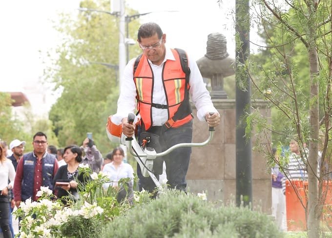 Acompañado por el presidente municipal José Chedraui, el mandatario impulsó una jornada de limpieza que incluyó pinta de bolardos, rehabilitación de pasos peatonales, poda de camellones y mantenimiento en la zona del Paseo Bravo como la fuente histórica frente al mausoleo de Nicolás Bravo, exgobernador e insurgente.