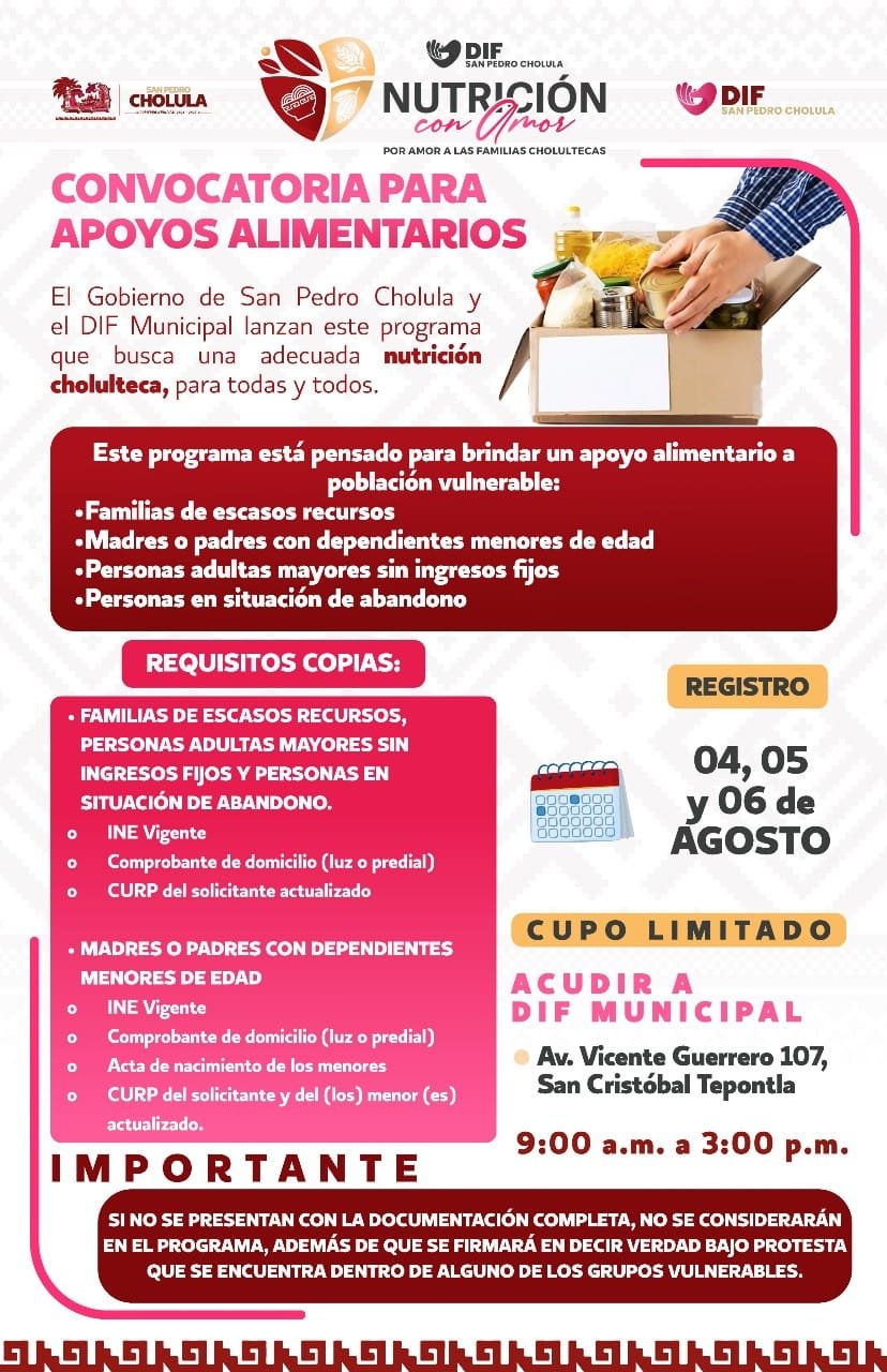 4 de agosto, 2025. San Pedro Cholula, Pue. – El Gobierno Municipal de San Pedro Cholula, encabezado por la Presidenta Tonantzin Fernández, informa que se amplía el periodo de registro para el programa de apoyos alimentarios “Nutrición Con Amor”, con el objetivo de garantizar mayor cobertura y beneficiar a un mayor número de familias en situación de vulnerabilidad.