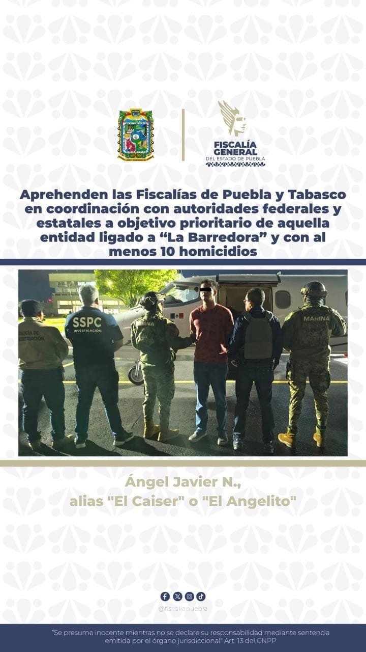 Como resultado de acciones de colaboración entre la Fiscalía General del Estado de Puebla, la Fiscalía General del Estado de Tabasco, la Secretaría de Seguridad y Protección Ciudadana y la Secretaría de Seguridad Pública Estatal de Puebla, se logró cumplimentar una orden de aprehensión en contra de Ángel Javier N., alias “El Caiser” o “El Angelito”, de 28 años de edad, identificado como objetivo prioritario por las autoridades tabasqueñas, ya que presuntamente se encuentra ligado al grupo delictivo “La Barredora” y a la comisión de al menos 10 homicidios.