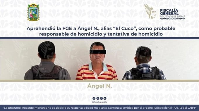 La Fiscalía General del Estado informa que se dio cumplimiento a la orden de aprehensión en contra de Ángel N., alias “El Cuco”, quien el pasado 10 de marzo, en compañía de otras personas, arribaron a bordo de un camión de la ruta S10, al paradero conocido como “Capulín”, de la junta auxiliar de San Andrés Azumiatla, en el municipio de Puebla, donde presuntamente agredieron con objetos de madera a dos víctimas, una de ellas trasladada a un nosocomio del sur de la ciudad donde perdió la vida a consecuencia de las lesiones que le provocaron.