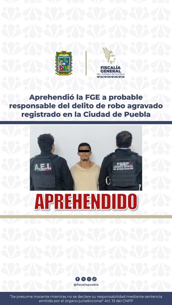 La Fiscalía General del Estado dio cumplimiento a la orden de aprehensión en contra de Víctor Hugo N., de 26 años de edad, por su probable responsabilidad del delito de robo agravado, ocurrido en la ciudad de Puebla.