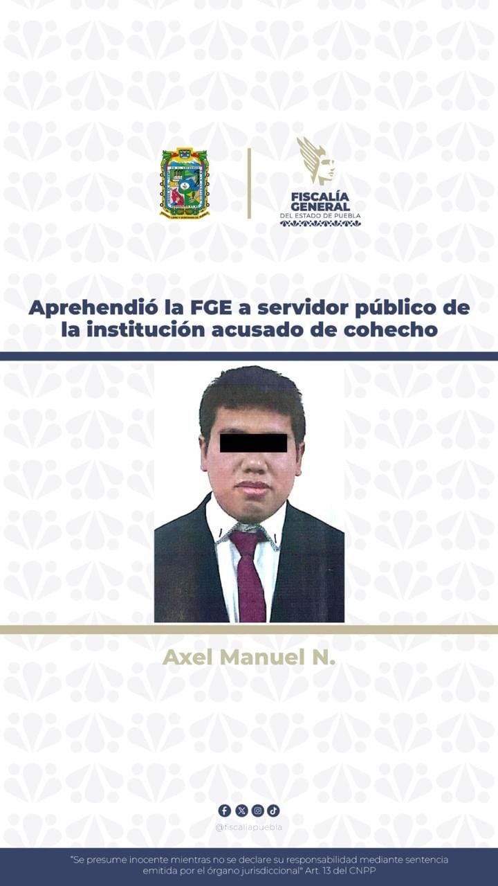 Como resultado de la estricta y permanente supervisión del actuar del personal de la Fiscalía General del Estado de Puebla, se cumplimentó una orden de aprehensión en contra de Axel Manuel N., de 28 años de edad, quien se desempeñaba como Agente del Ministerio Público, por su probable responsabilidad en la comisión del delito de cohecho.