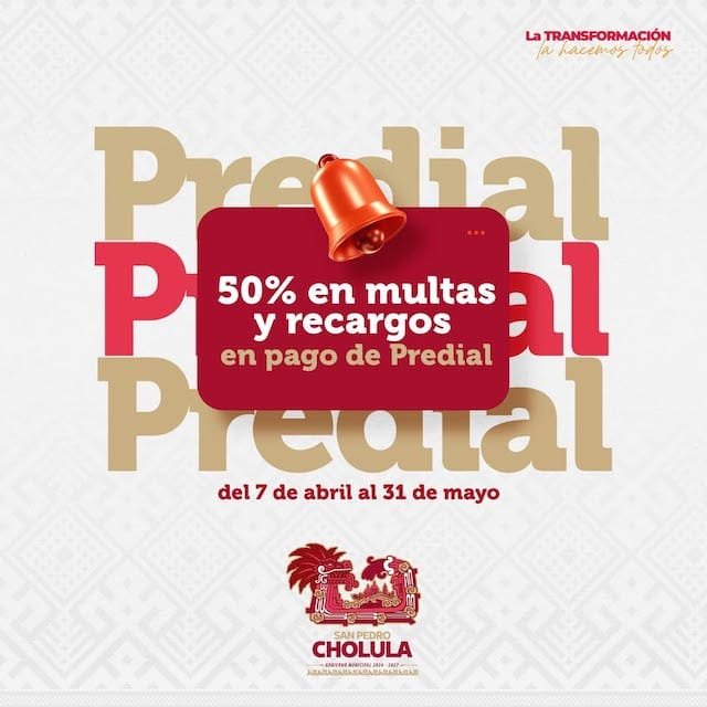 Desde este lunes 7 de abril y hasta el 31 de mayo, habrá descuentos del 50 por ciento en pagos y multas por el predial 2025 en San Pedro Cholula, tras el aval del Cabildo del Ayuntamiento.