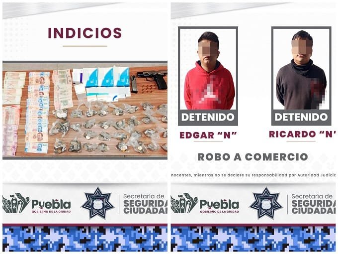 Elementos de la Policía de la Ciudad, detuvieron a Edgar “N”, de 23 años de edad y a Ricardo “N”, de 32 años de edad, señalados por su probable participación en el robo de una farmacia ubicada en inmediaciones de la colonia Jesús García.