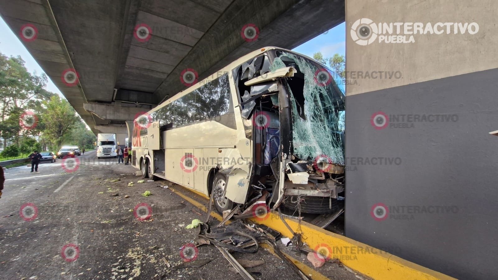 Varios pasajeros de un autobús de turismo sufrieron lesiones leves por un choque y volcadura, en la autopista México-Puebla, en el municipio de Cuautlancingo.