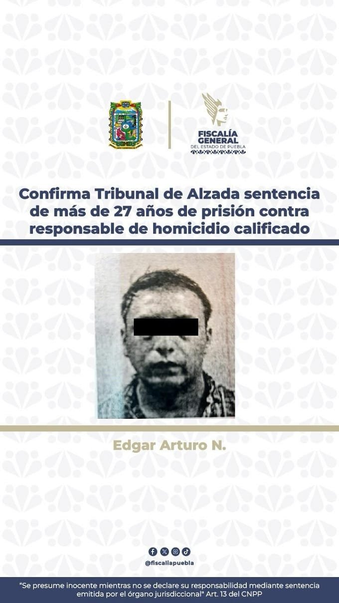 El Tribunal de Alzada confirmó la sentencia de primera instancia con base en los argumentos vertidos por la Fiscalía General del Estado, en contra Edgar Arturo N., quien permanecerá más de 27 años en prisión, por su responsabilidad penal en el delito de homicidio calificado, en agravio de un hombre en la ciudad de Puebla.
