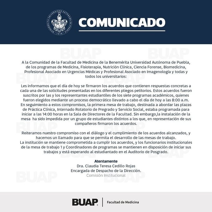 “Estos acuerdos fueron suscritos por las y los representantes estudiantiles de los siete programas académicos, quienes fueron elegidos mediante un proceso democrático llevado a cabo el día de hoy a las 8:00 am. En seguimiento a estos compromisos, la primera mesa de trabajo, destinada a abordar las plazas de práctica clínica, internado rotatorio de posgrado y servicio social, estaba programada para iniciar a las 14:00 horas en la Sala de Directores de la Facultad. Sin embargo, la instalación de la mesa ha sido impedida por un grupo de estudiantes distintos a los que, en representación de sus compañeros firmaron los acuerdos”.