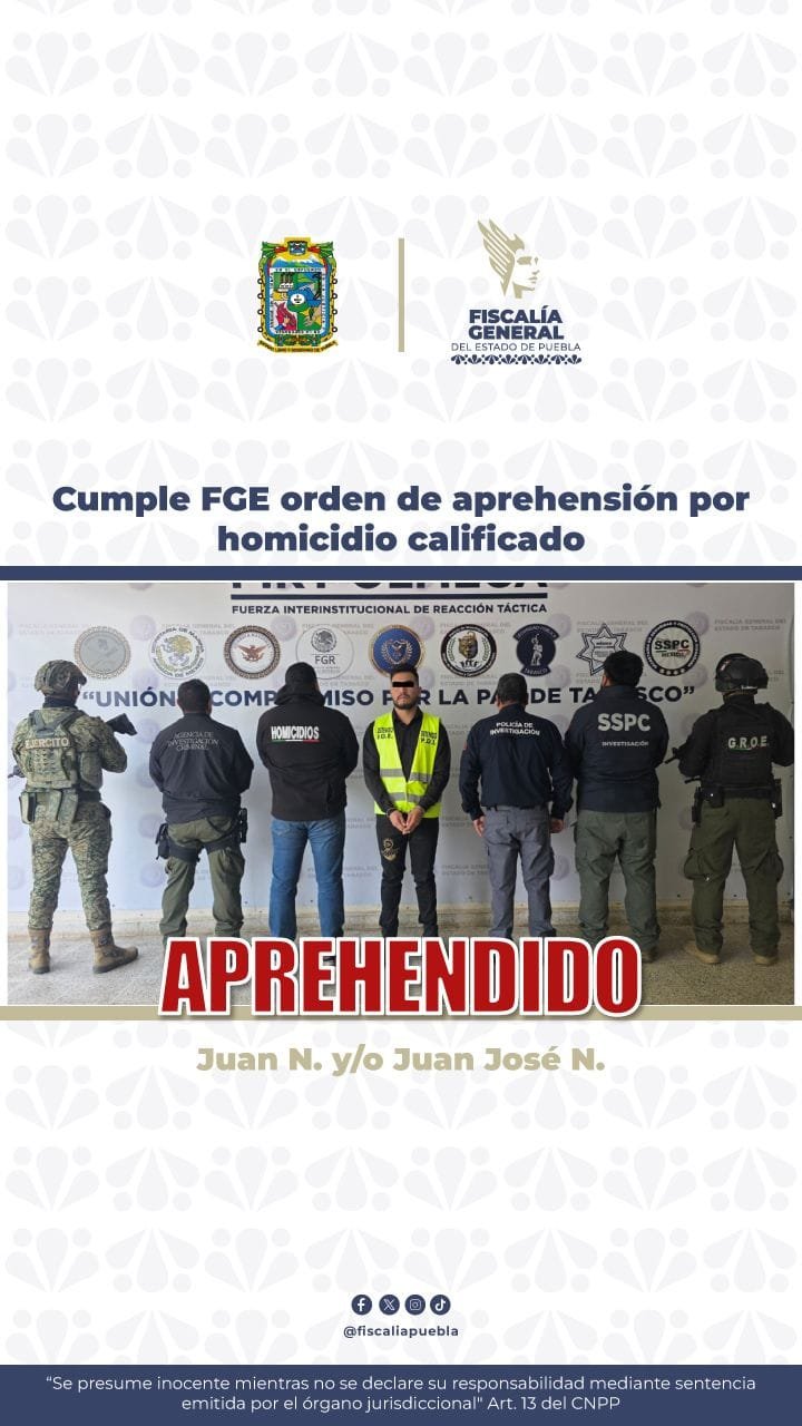 CIUDAD DE PUEBLA, Pue.- La Fiscalía General del Estado de Puebla (FGE), en colaboración con autoridades del estado de Tabasco, cumplió una orden de aprehensión en contra de Juan N. y/o Juan José N., por su probable responsabilidad en el delito de homicidio calificado.