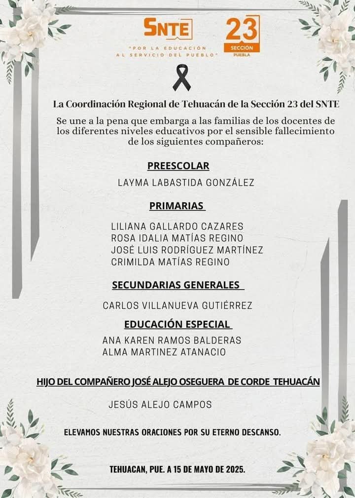 Entre las 21 víctimas mortales del accidente en la carretera Cuacnopalan-Oaxaca, se encontraban 8 docentes pertenecientes al SNTE sección 23, así lo informó la coordinación regional de Tehuacán quien se solidarizó con los familares de los fallecidos.