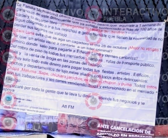 Cabe hacer mención que el primer día de octubre, otras tres lonas, amenazando al mismo líder de comerciantes, fueron dejadas en distintos puntos de la ciudad de Puebla.