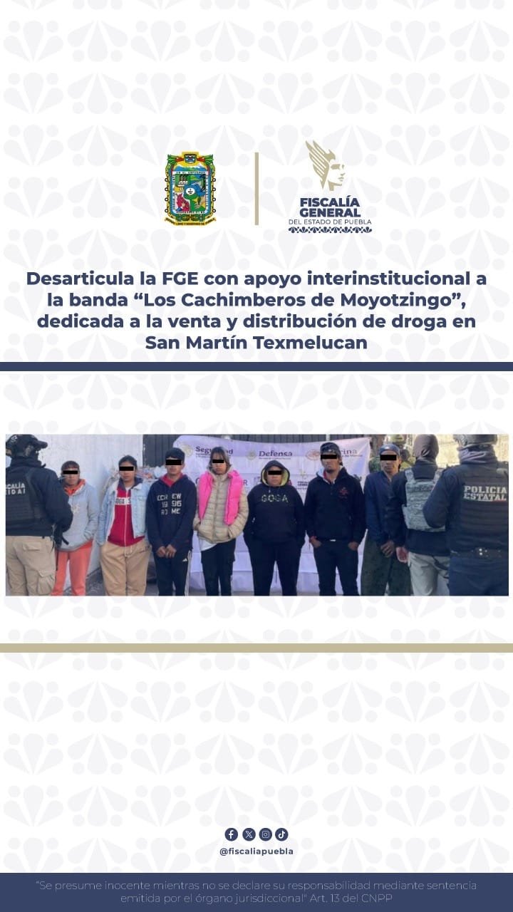 La Fiscalía General del Estado encabezó un operativo interinstitucional con apoyo de la Secretaría de la Defensa Nacional (DEFENSA) y la Secretaría de Seguridad Pública Estatal (SSPE), que dio como resultado la desarticulación de la banda de “Los Cachimberos de Moyotzingo”, integrada por siete personas presuntamente dedicadas desde hace varios años a la venta y distribución de estupefacientes en la región de San Martín Texmelucan.