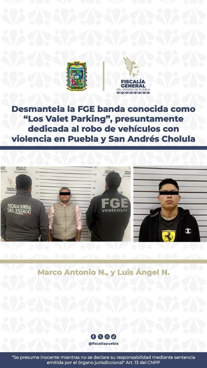 La Fiscalía General del Estado de Puebla logró desmantelar a la banda delictiva conocida como “Los Valet Parking”, presuntamente dedicada al robo de vehículos con violencia en los municipios de Puebla y San Andrés Cholula. A través de labores de inteligencia, campo y gabinete, se logró la detención de sus presuntos integrantes, Marco Antonio N. y Luis Ángel N., quienes ya fueron puestos a disposición de la autoridad judicial.