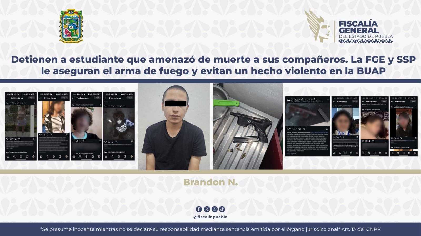 Mediante trabajo de coordinación interinstitucional entre la Fiscalía General del Estado de Puebla y la Policía Cibernética de la Secretaría de Seguridad Pública del Estado, se llevaron a cabo acciones de investigación e inteligencia, tras detectar publicaciones en redes sociales que contenían amenazas dirigidas a estudiantes y personal docente de la Benemérita Universidad Autónoma de Puebla (BUAP), lo cual permitió obtener resultados inmediatos para esclarecer este caso.