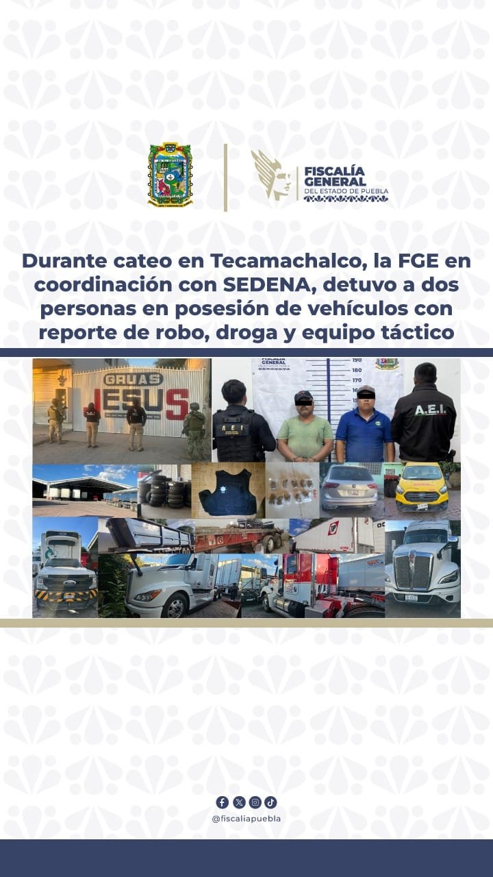 La Fiscalía General del Estado de Puebla informa que en una acción coordinada con la Secretaría de la Defensa Nacional (SEDENA), se logró la detención de José Antonio N. y José Trinidad N., así como el aseguramiento de vehículos robados, droga y equipo táctico, entre otros indicios.