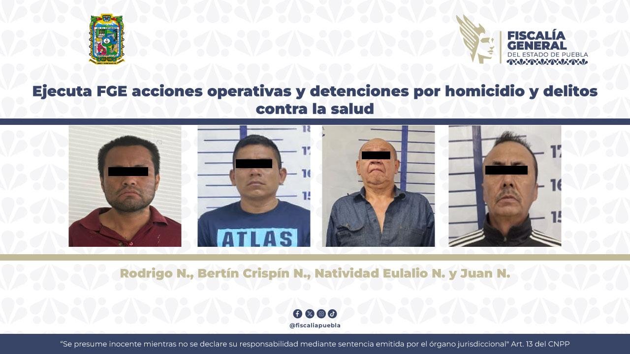 Como resultado de acciones de investigación y operativos en distintos municipios, la Fiscalía General del Estado de Puebla (FGE) realizó detenciones en flagrancia y cumplimentó órdenes de aprehensión por delitos de alto impacto, así como por delitos contra la salud.