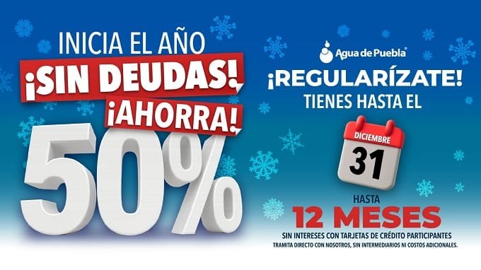 Puebla, Pue., a 07 de diciembre de 2025. – Agua de Puebla informa a todos los usuarios que cuentan con adeudos en los servicios de agua potable, drenaje y saneamiento, que el próximo 31 de diciembre de 2025 será el último día para ponerse al corriente con un 50% de ahorro en su deuda, deban lo que deban sin importar el monto, a través del programa Regularízate.