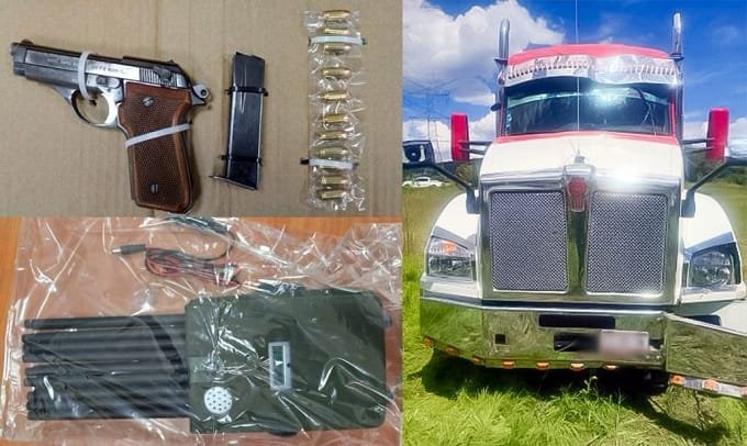 Durante esta intervención, se aseguraron un arma de fuego, 11 cartuchos útiles, un inhibidor de señal con 18 antenas y un tractocamión marca Kenworth, color blanco con rojo.