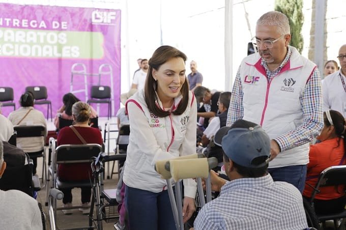 Acompañada por el director general, Jesús Alejandro Cortés Carrasco, realizó la entrega de 43 sillas de ruedas para adulto, tres sillas de ruedas infantil, una silla de ruedas PCI, una silla de ruedas PCA, cinco sillas andaderas, seis andaderas ortopédicas, nueve bastones de cuatro puntos, tres bastones guía y tres bastones ortopédicos, sumando un total de 74 aparatos rehabilitatorios.