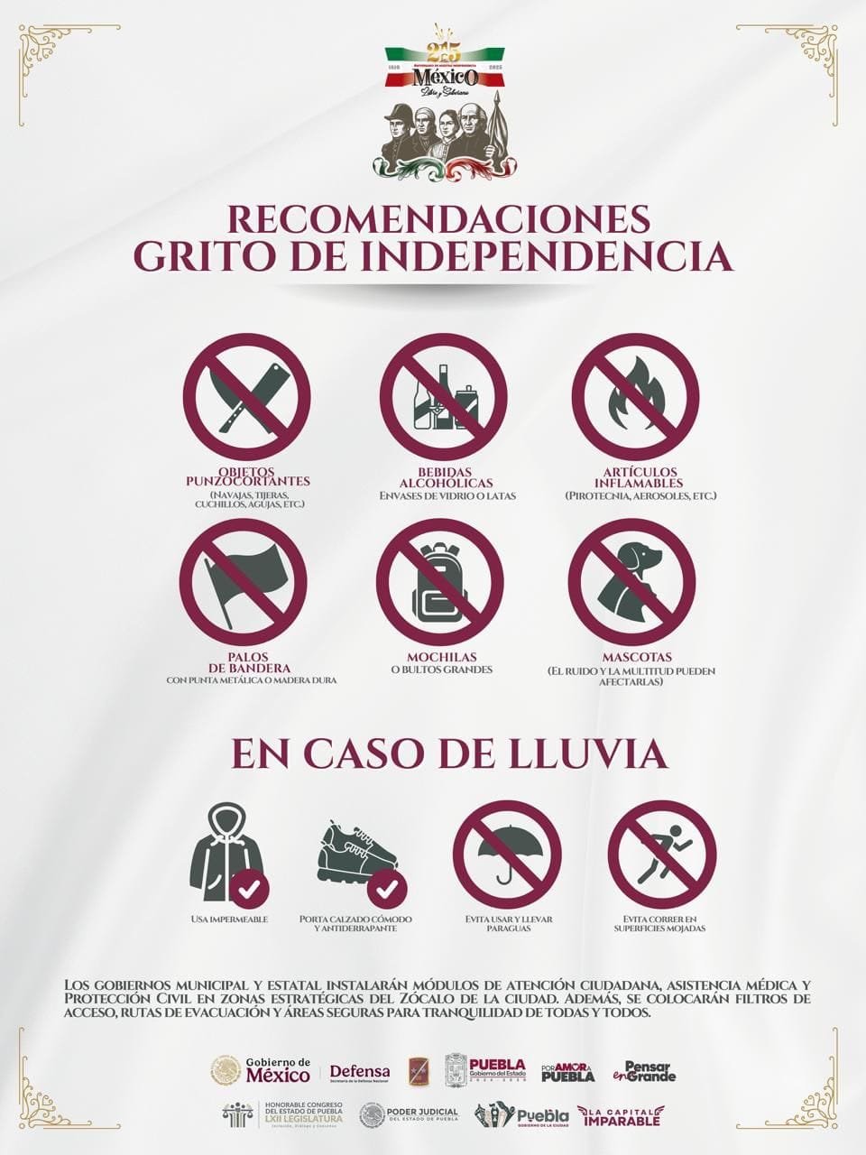 Para que la sociedad poblana disfrute del tradicional Grito de Independencia en un entorno de paz y orden, el Gobierno de la Ciudad, encabezado por el presidente municipal, Pepe Chedraui Budib, informa que en los accesos al Zócalo no se permitirá el ingreso con los siguientes objetos: