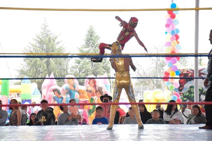 Momentos después arrancó la feria con una exhibición de lucha libre, al tiempo que los pequeños podían divertirse en la feria donde había juegos como la lotería, las canicas, el boliche.