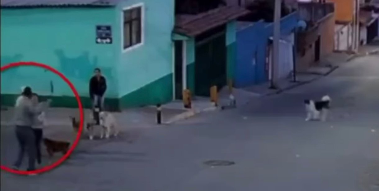 En las imágenes se observa a un hombre, vestido con un suéter gris, persiguiendo a varios perros en la vía pública con un machete. La mujer interviene y lo empuja en un intento por detener la agresión.