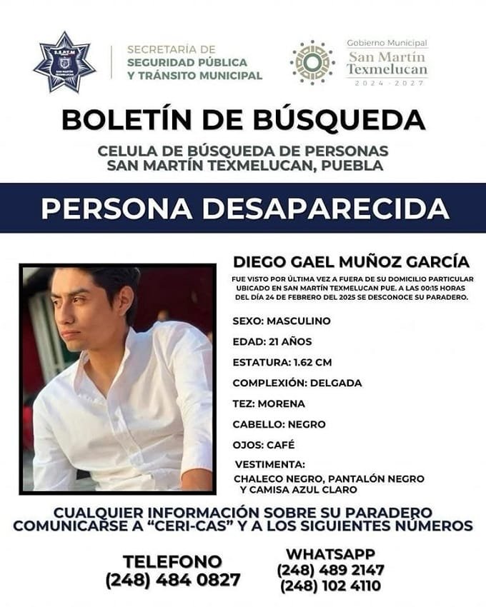 Diego Gael Muñoz García, de 21 años, quien estaba reportado como desaparecido, fue localizado sin vida, en el municipio de San Martín Texmelucan.