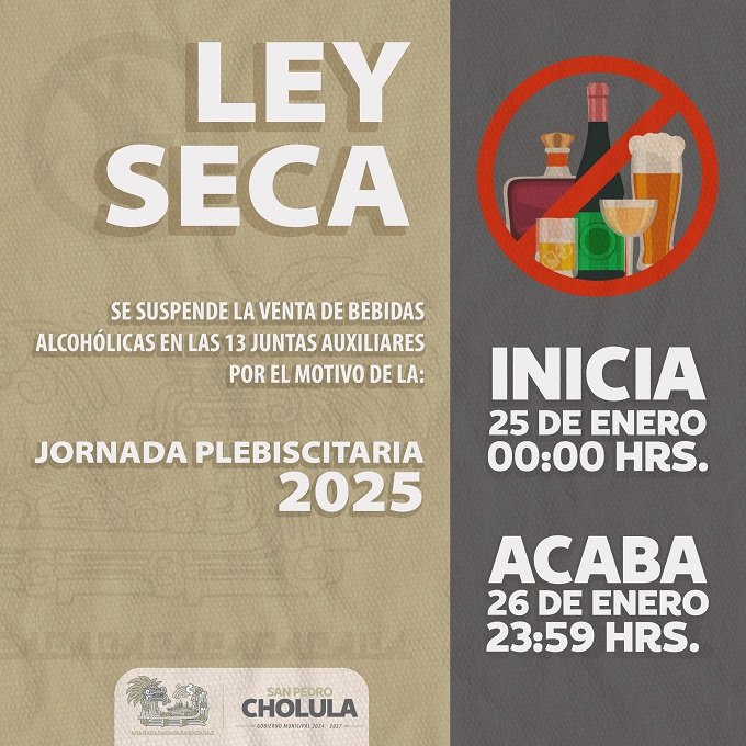 Las y los integrantes de Cabildo de San Pedro Cholula, junto con la presidenta municipal, Tonantzin Fernández, aprobaron la puesta en marcha de la “Ley Seca” en las 13 juntas auxiliares, con motivo de los plebiscitos, los cuales se realizarán el 26 de enero.