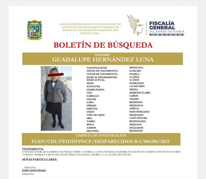 Como resultado de labores de investigación a cargo de la Fiscalía General del Estado de #Puebla, en coordinación con la Comisión de Búsqueda de Personas del Estado de Puebla, se localizó en buen estado de salud a la menor Guadalupe N., de 13 años de edad, quien fue reportada como no localizada el pasado 24 de febrero de 2025 en la colonia El Conde de la ciudad de Puebla.