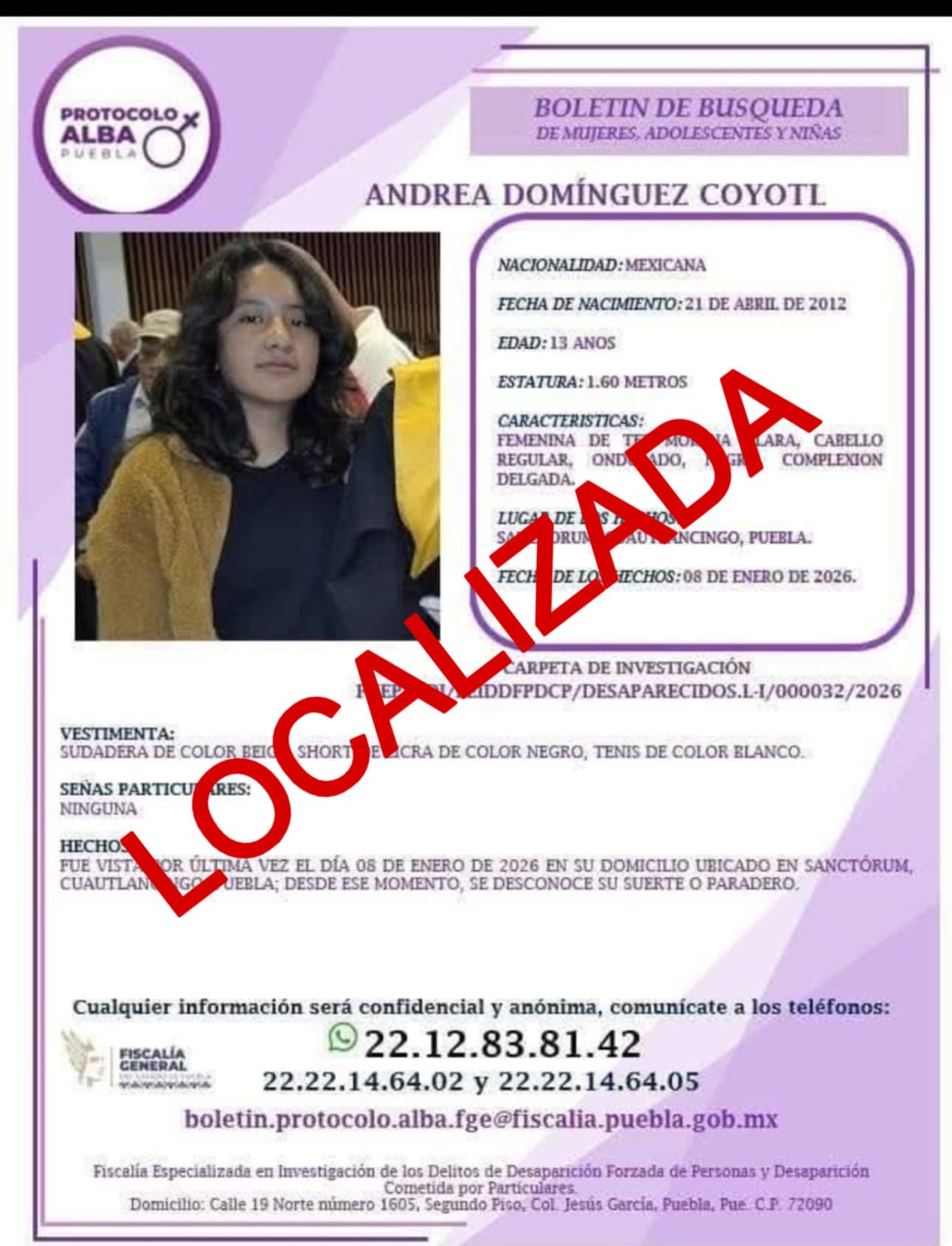 La Fiscalía General del Estado informa que fue localizada Andrea N., reportada como desaparecida en el municipio de Cuautlancingo, Pue.
