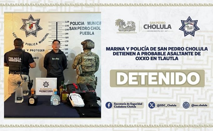 Elementos de la Secretaría de Marina (SEMAR) y policías de la Secretaría de Seguridad Ciudadana de San Pedro Cholula (SSC Cholula), detuvieron a Jeshua “N” de 19 años, por su probable participación en el robo a un OXXO, ubicado en la Junta Auxiliar de San Juan Tlautla.