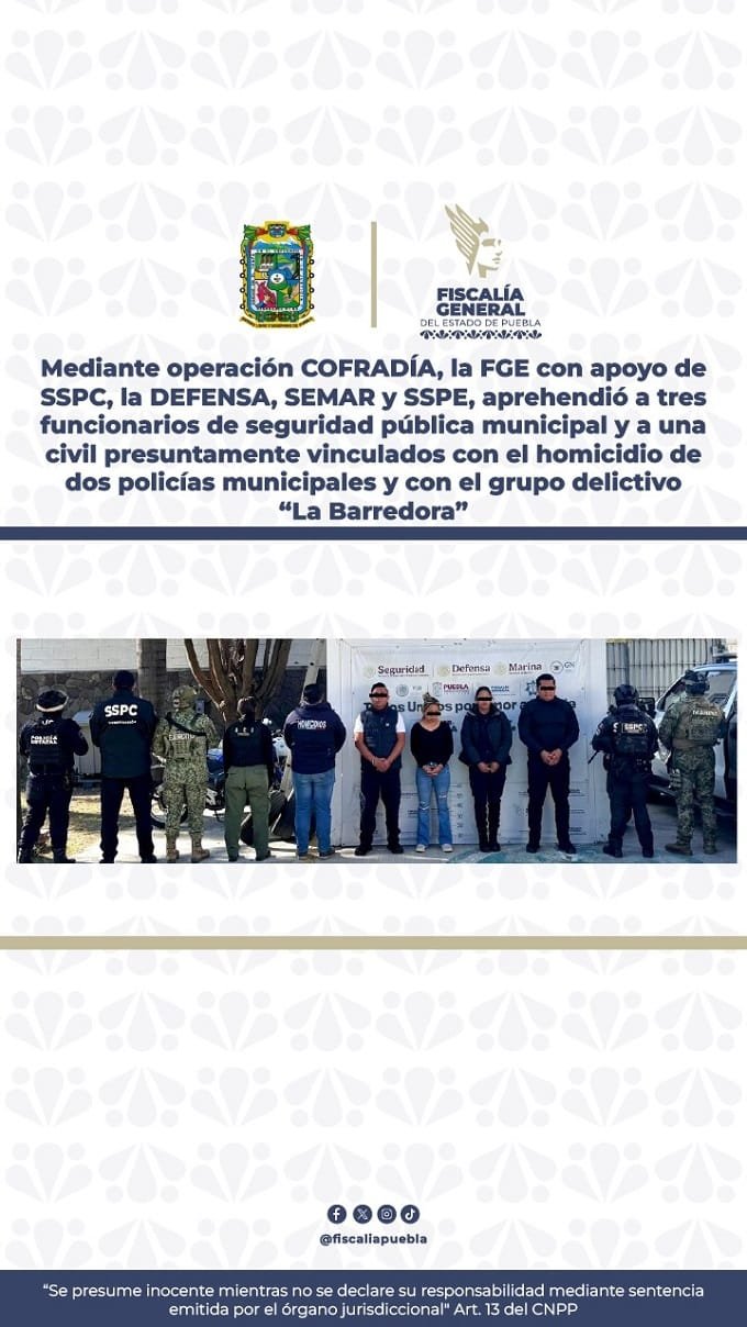 Derivado de la sólida coordinación interinstitucional, autoridades de los tres órdenes de gobierno desplegaron la Operación COFRADÍA, encabezada por la Fiscalía General del Estado de Puebla (FGE), con el apoyo de la Secretaría de Seguridad y Protección Ciudadana (SSPC), la Secretaría de la Defensa Nacional (DEFENSA), la Secretaría de Marina (SEMAR) y la Secretaría de Seguridad Pública Estatal (SSPE), logrando el cumplimiento de órdenes de aprehensión en contra de Hugo N., Atanacio N. y Rocío N., servidores públicos de la Secretaría de Seguridad Ciudadana de Puebla, así como de otra persona de nombre Ana Belem N., presuntamente vinculados con el homicidio de dos policías municipales y con el grupo delictivo “La Barredora”.