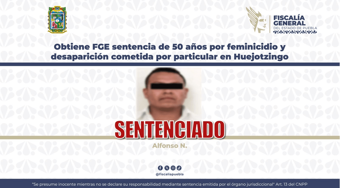 CIUDAD DE PUEBLA, Pue.- La Fiscalía General del Estado de Puebla (FGE) obtuvo sentencia condenatoria contra Alfonso N., por el delito de feminicidio, por hechos ocurridos en el municipio de Huejotzingo.