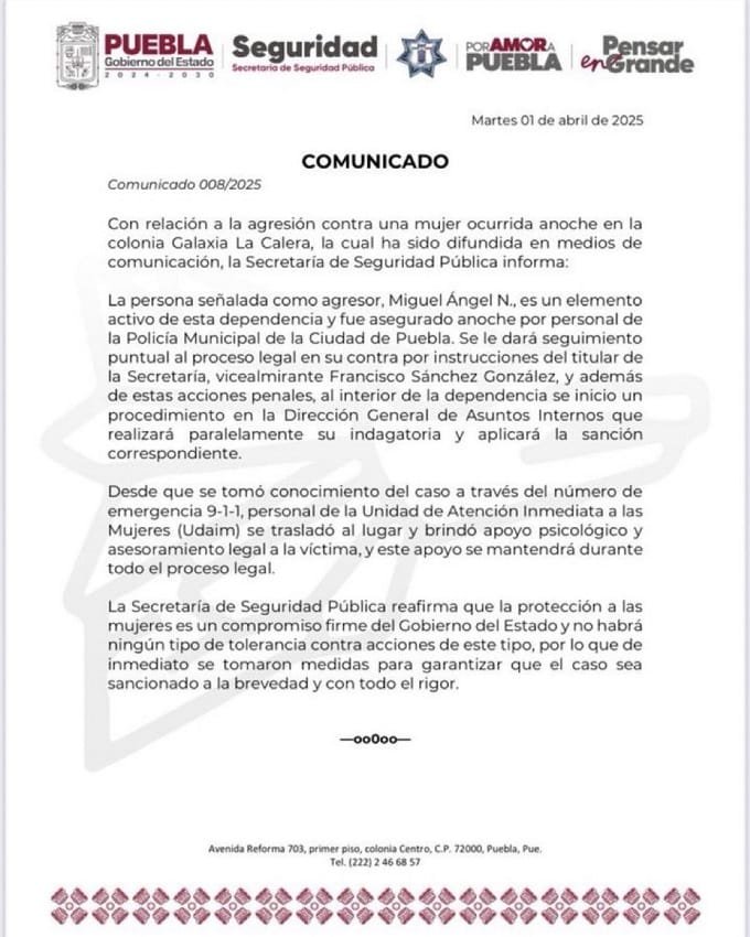 “La persona señalada como agresor, Miguel Ángel N., es un elemento activo de esta dependencia y fue asegurado anoche por personal de la Policía Municipal de la Ciudad de Puebla”, se lee en el comunicado.