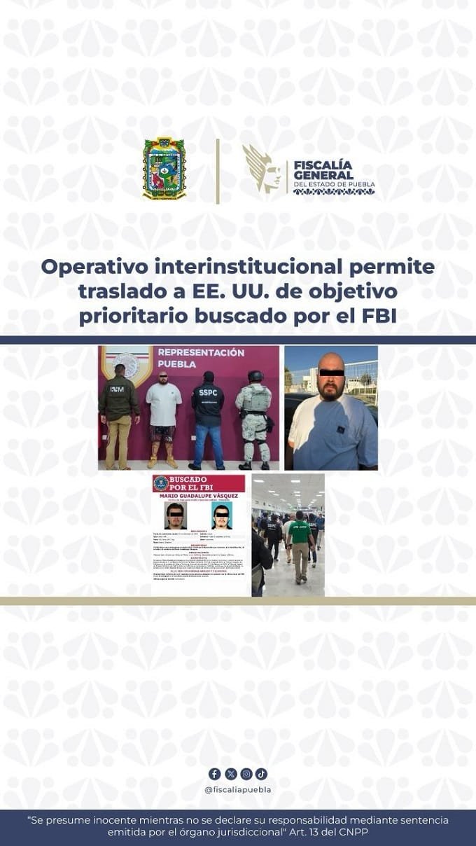 Como resultado de una operación derivada de la detención en el estado de Puebla por parte de la Policía Estatal de un hombre identificado como Mario Guadalupe N., en posesión de estupefacientes, la Secretaría de Seguridad y Protección Ciudadana (SSPC), el Instituto Nacional de Migración (INM) y la Fiscalía General del Estado de Puebla (FGE), concretaron su traslado a Estados Unidos, luego de que se corroboró que era un objetivo prioritario requerido por el Federal Bureau of Investigation (FBI).