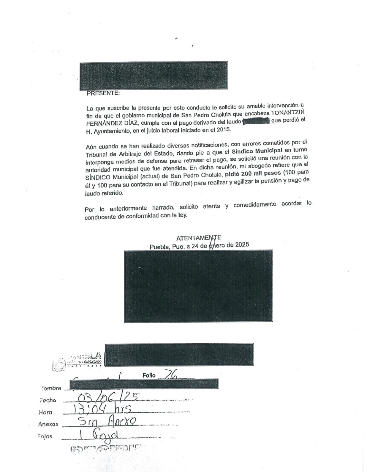 Cabe recordar que a inicios de este año, una ciudadana identificada como Laura “N” ingresó un oficio a la Oficialía de Partes de la oficina del gobernador Alejandro Armenta, solicitando el cumplimiento de un laudo que el Ayuntamiento perdió en 2015. En dicho documento, la afectada señaló que el síndico municipal le pidió 200 mil pesos para agilizar el pago correspondiente.