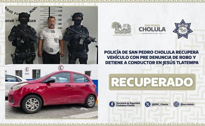 Como resultado de una acción oportuna y coordinada, elementos de la Secretaría de Seguridad Ciudadana de San Pedro Cholula (SSC Cholula) aseguraron un vehículo con pre denuncia de robo y realizaron la detención del conductor, en el barrio de Jesús Tlatempa.