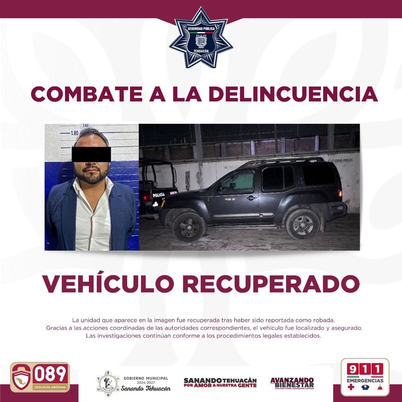 Elementos de la Policía Municipal lograron la recuperación de un vehículo con reporte de robo y la detención de su conductor, durante un operativo realizado en inmediaciones de la junta auxiliar de San Lorenzo Teotipilco.