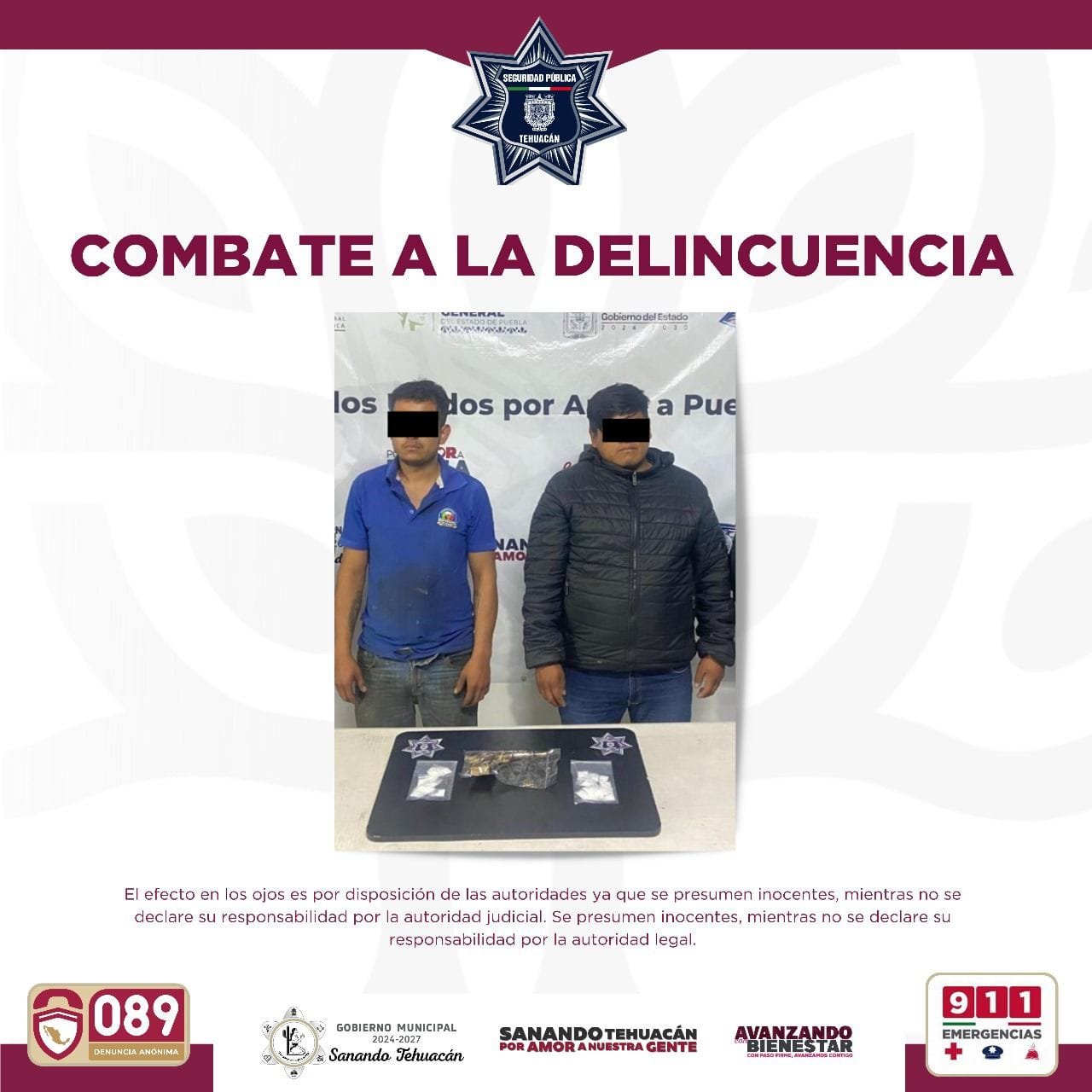 Elementos de la Policía Municipal de Tehuacán detuvieron a Edin N., alias “El Gallero”, y Cristian N., alias “El Venado”, en inmediaciones de la colonia Centro, luego de localizarles un arma de fuego tipo pistola, cuatro cartuchos útiles y veintinueve bolsas tipo ziploc con producto granulado con características del narcótico conocido como cristal.