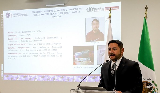 • En una segunda intervención, el día 10 de diciembre vía la Dirección de Emergencias y Respuesta Inmediata (DERI), se nos informa del robo a una gasolinera por un masculino con arma de fuego, quien al momento de huir a bordo de una camioneta Chevrolet Silverado 2011 color negro, dispara en contra de uno de los despachadores, lesionándolo en el brazo izquierdo. De manera inmediata se emprenden acciones de reacción, a través de todas las herramientas con las que cuenta la Secretaría, como video vigilancia, despliegue territorial y el uso de aeronaves no tripuladas, logrando ubicar al vehículo en diferentes puntos de la ciudad, generando una persecución de aproximadamente 25 minutos, al momento de dar alcance a la unidad, el conductor hace caso omiso por lo que se implementa el uso de la fuerza para su detención, logrando hacer que se detenga el vehículo en el que huía y asegurando a Joseph N de 26 años originario de Puebla, quien portaba un arma de fuego calibre .9 mm, MARCA CANIK, así como el vehículo en el que ejecutó el delito sin placas. Es importante destacar que el probable responsable había pertenecido a la Policía Municipal, quien fue dado de baja por no acreditar los exámenes de control y confianza.