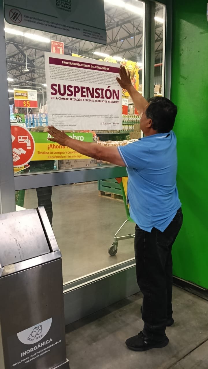 El establecimiento, perteneciente a la empresa Nueva Wal-Mart de México, S. de R.L. de C.V., fue sancionado con la medida precautoria de suspensión de la comercialización de bienes, productos y servicios, por lo que se colocó un sello de suspensión en sus instalaciones.
