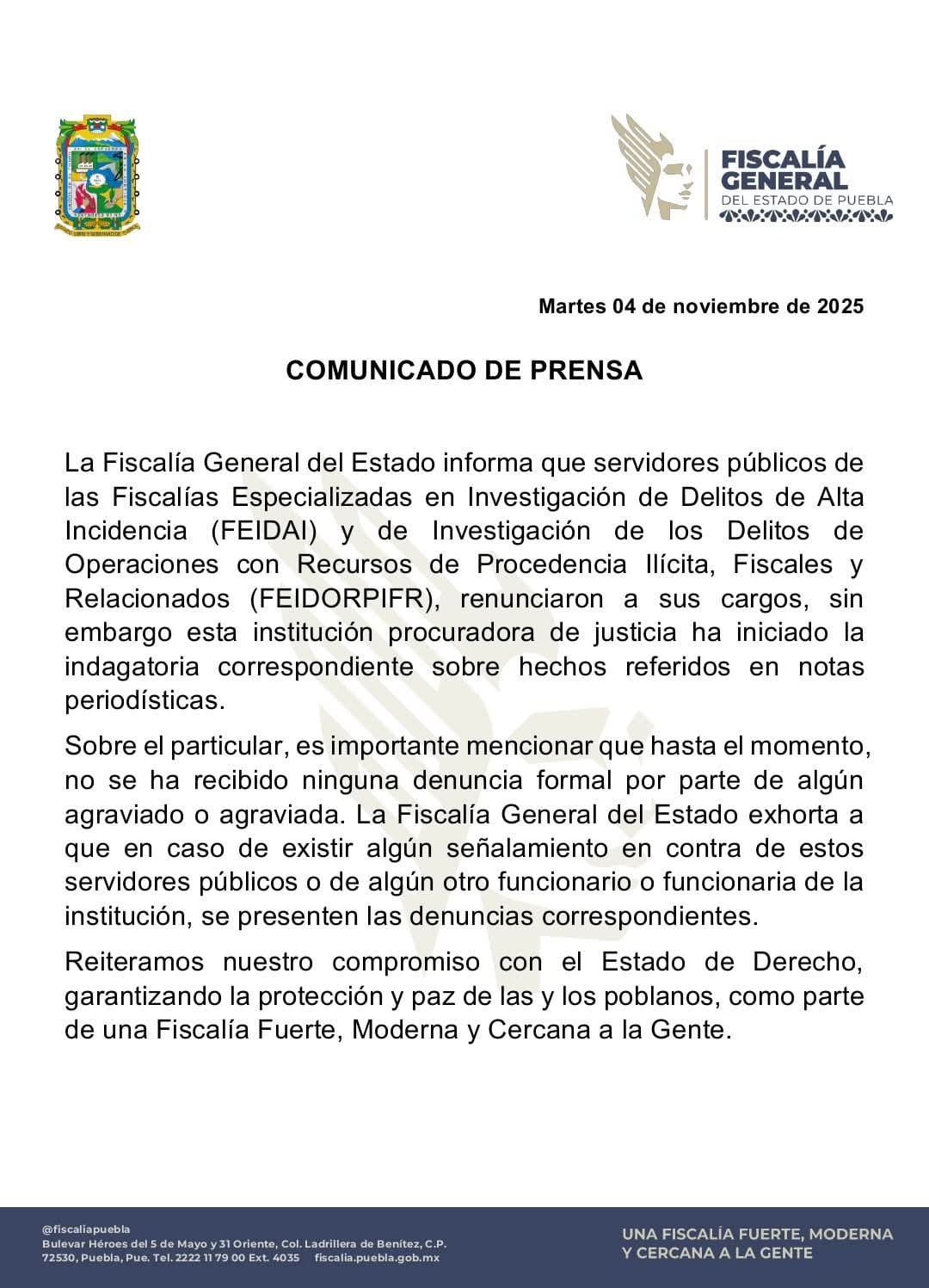 La Fiscalía General del Estado de Puebla informó que servidores públicos pertenecientes a las Fiscalías Especializadas en Investigación de Delitos de Alta Incidencia (FEIDAI) y en Delitos de Operaciones con Recursos de Procedencia Ilícita, Fiscales y Relacionados (FEIDORPIFR) presentaron su renuncia a los cargos que desempeñaban.