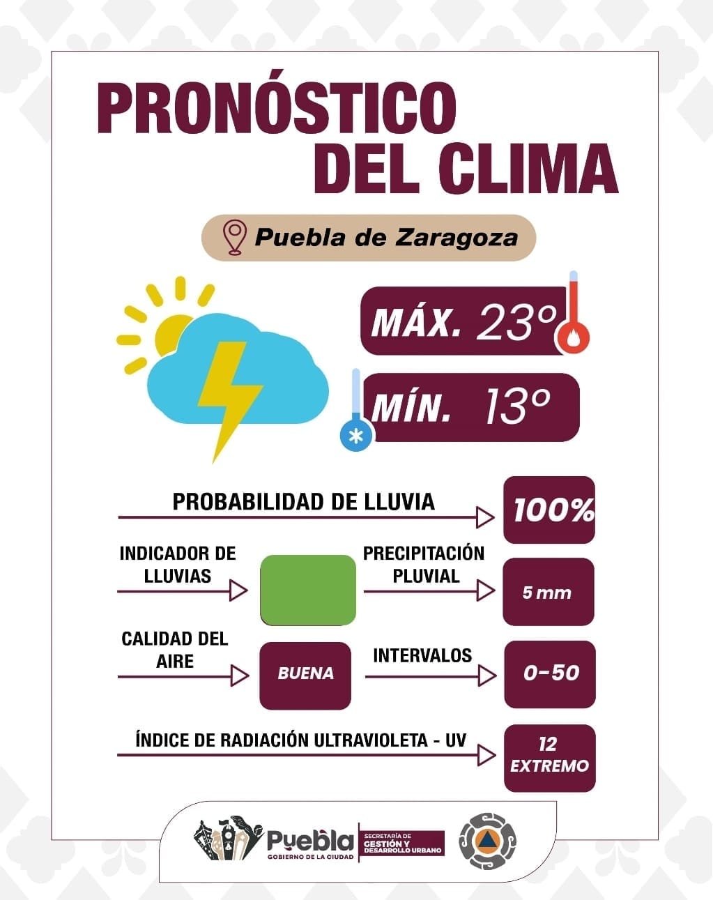 Para este día se pronostica un clima parcialmente nublado, con alta probabilidad de lluvia acompañada de tormenta eléctrica durante la tarde, especialmente alrededor de las 16:00 horas, con una acumulación estimada de entre 0 y 5 mm. La temperatura oscilará entre una máxima de 23°C y una mínima de 13°C.