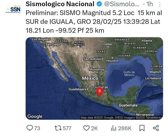 La Secretaría de Seguridad Ciudadana (SSC) informa, a través del área de Protección Civil Municipal, que luego del reporte que emitió el Sistema Sismológico Nacional de México, tras el sismo de 5.2 grados con epicentro en Iguala, Guerrero, se activó el protocolo de recorridos y supervisión por la ciudad.