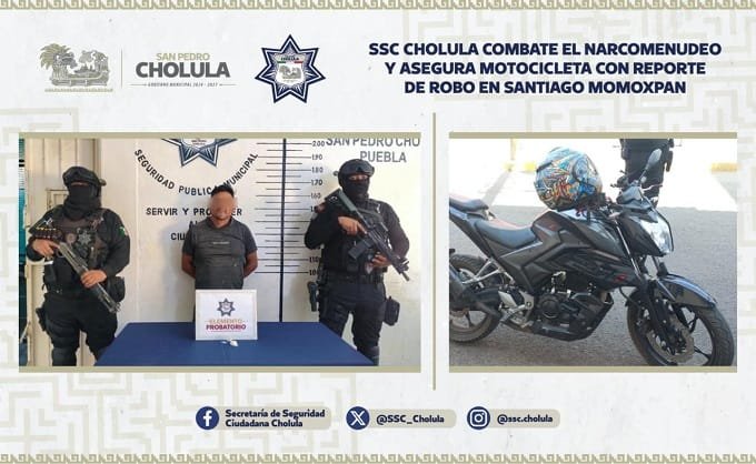 19 de enero, 2025. San Pedro Cholula, Pue. – Derivado de los recorridos de vigilancia preventiva y estratégica, elementos de la Secretaría de Seguridad Ciudadana de San Pedro Cholula (SSC Cholula) aseguraron a un masculino por su probable participación en delitos contra la salud, así como por la posesión de una motocicleta con predenuncia de robo, en la Junta Auxiliar de Santiago Momoxpan.