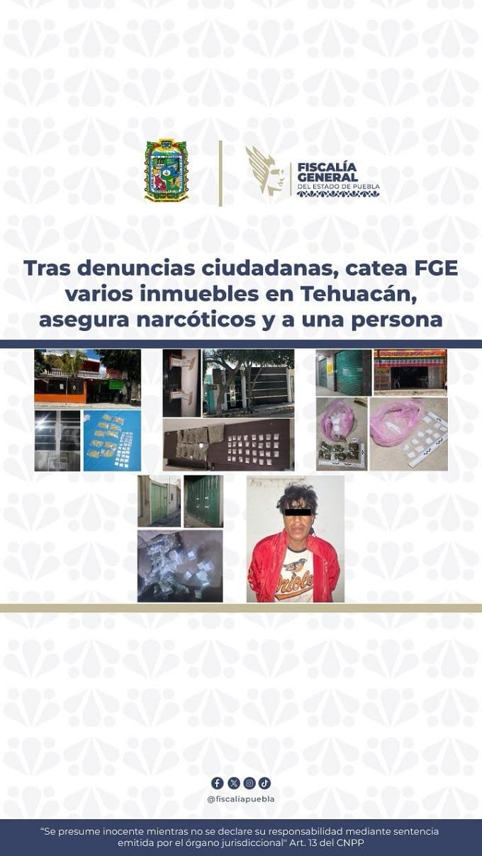 En cumplimiento a órdenes giradas por Jueces de Control, la Fiscalía General del Estado cateó diversos inmuebles ubicados en el municipio de Tehuacán, logrando el aseguramiento de múltiples dosis de droga y la detención de una persona presuntamente vinculada a actividades de narcomenudeo.